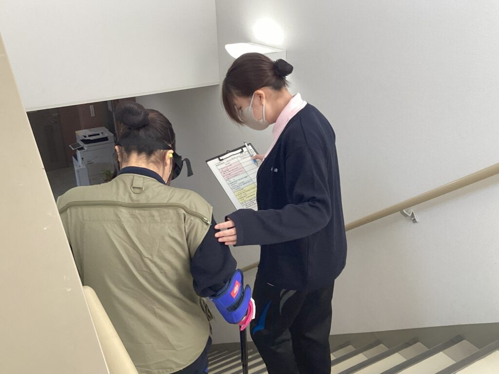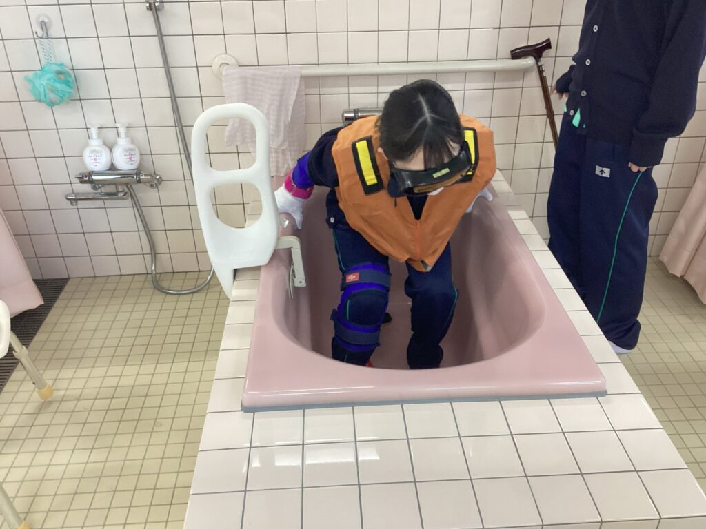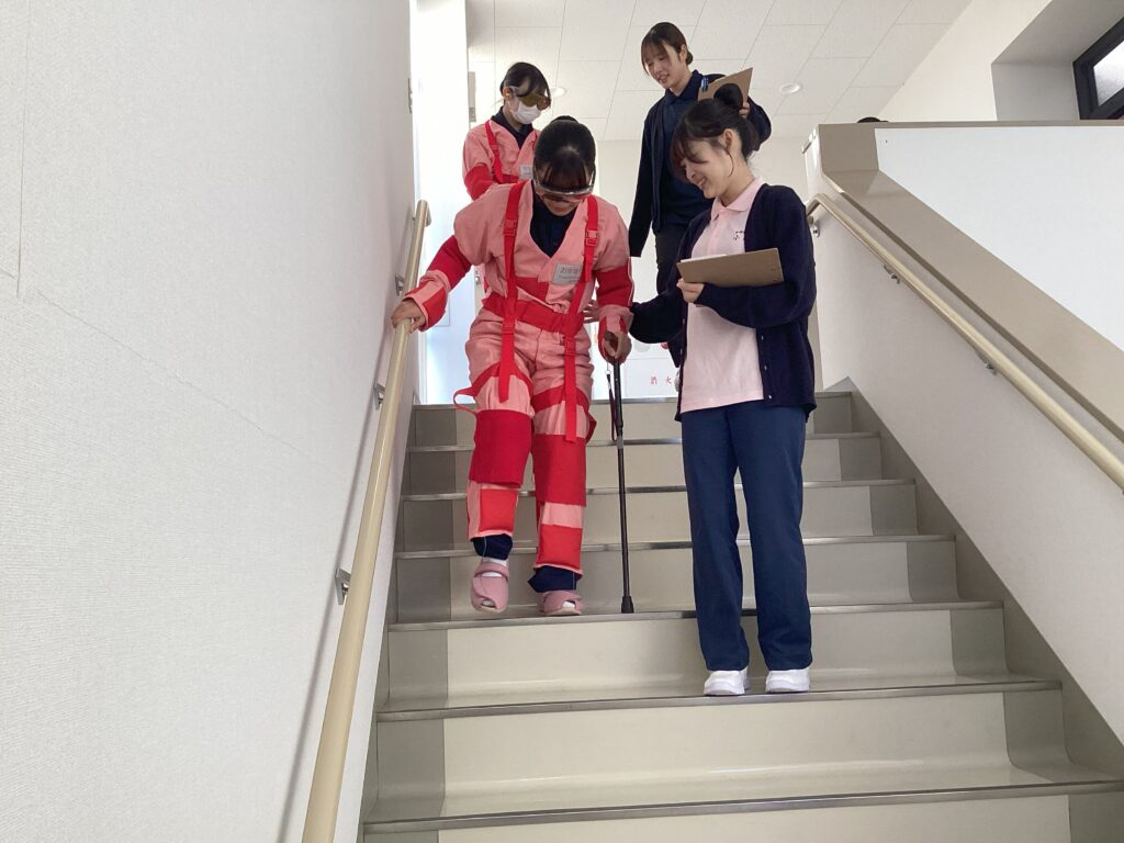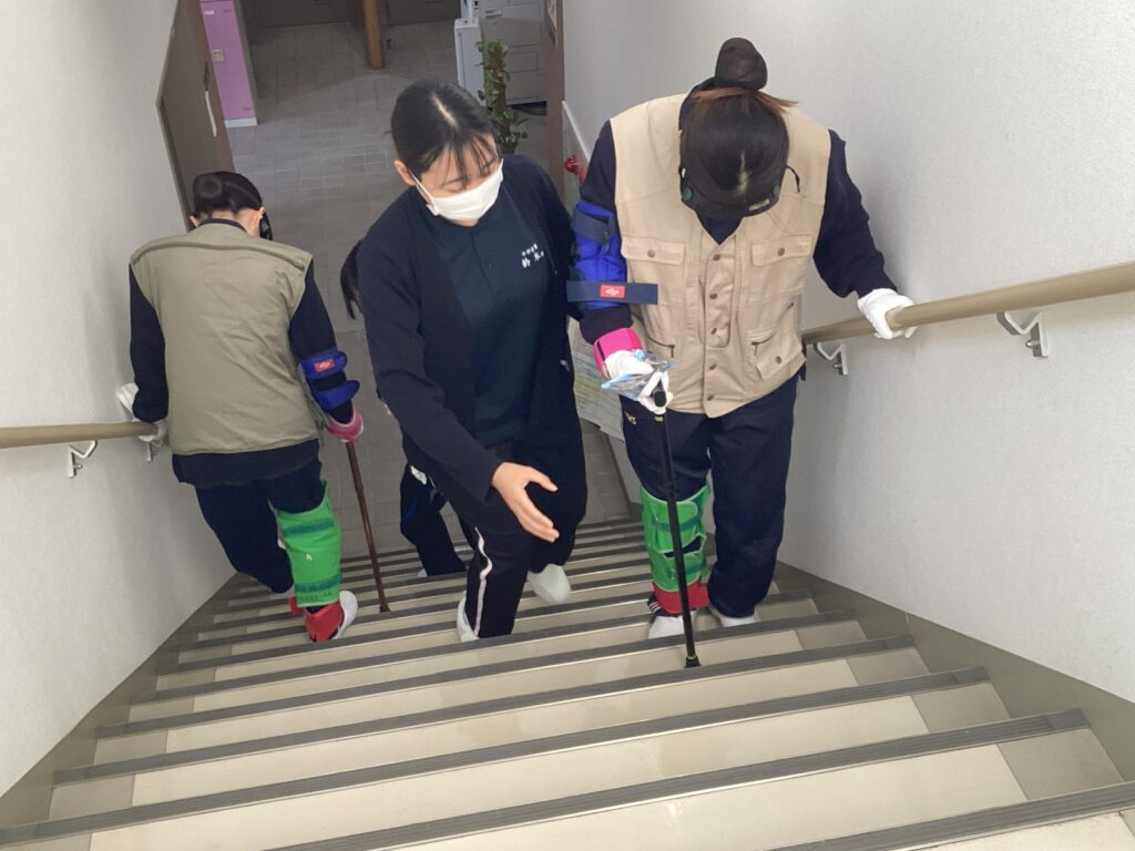 高齢者体験スーツの着用やゴーグル、手袋、耳栓も装着して、階段昇降や自動販売機での飲み物購入体験、トイレやベッドへの移動など、高齢者の日常に触れながら全員が高齢者疑似体験をしました。