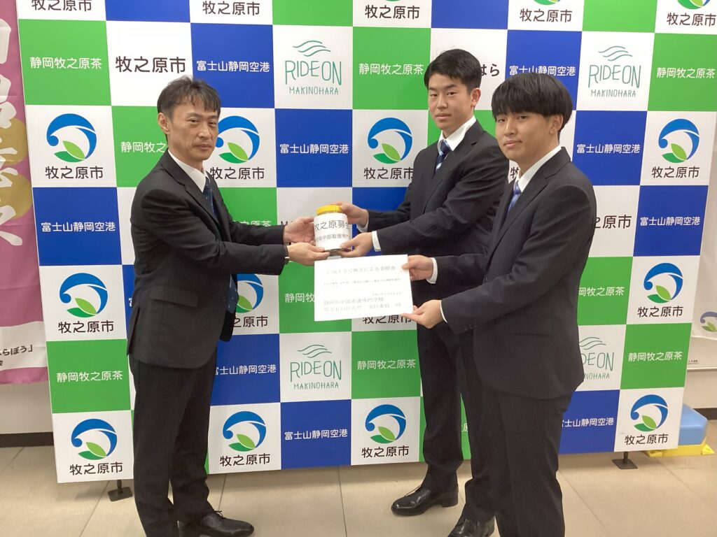 桂花祭での商品販売の収益の一部と合わせて12月22日、牧之原市に寄付をさせて頂きました。